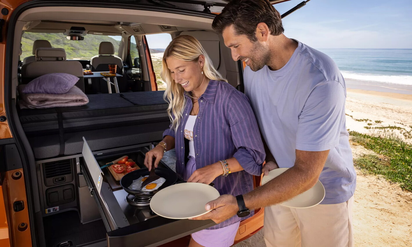 De Beach Camper is uitgerust met een praktische minikeuken met een gaskookplaat aan de achterzijde, beschut onder de open klep. De California Coast en Ocean bieden een compleet vernieuwde zomerkeuken met een gaskookplaat, spoelbak en een slim geplaatste koelkast. Dankzij de schuifdeur is de koelkast zowel van binnen als buiten toegankelijk, ideaal voor elke kampeertrip.